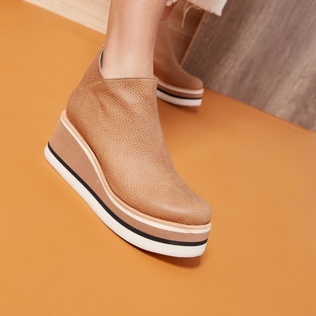 Ezeket az ék alakú bokacsizmákat a modern nők számára tervezték, akik a stílust a mindennapi kényelemmel szeretnék ötvözni. Elegáns, kortárs dizájnjával ezek a csizmák sokoldalúságukkal tűnnek ki, könnyen alkalmazkodnak a legkülönbözőbb alkalmakhoz, a hétköznapi kirándulástól a kifinomultabb megjelenésig. A finom fűzés a kényelem veszélyeztetése nélkül növeli a magasságot, így ezek a csizmák ideális választásnak bizonyulnak azon nők számára, akik stílusosan szeretnének kinézni anélkül, hogy a kényelmet feláldoznák.